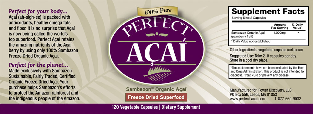 What is so unique about the Acai berry? Dr. Perricone named the Acai berry as the #1 Superfood in the world! The Acai fruit has been featured on Oprah, The Today Show, The CBS Early Show, in the Wall Street Journal, the New York Times, and more! Amazingly, the little Acai berry, about the size of a blueberry, is being called by many the miracle berry due to its amazing antioxidant qualities! The Acai Berry may well be one of the healthiest foods on the planet. However, its very difficult to find Acai in a pure form that maintains the berries natural level of nutrients and antioxidants. Acai only grows in the Amazon Rainforest and is very perishable. So, unless you live in the Amazon, you will not be able to find fresh Acai berry at your local store or fruit market. However, the Acai berry can be freeze dried and turned into a stable powder which maintains all the nutritional power of the fresh Acai berry! Given the berries popularity and media recognition, many companies have attempted to create an acai product simply to make money without regard to the quality of the product or the health of the consumer. Many juice products are very diluted and use unhealthy preservatives in order to increase the shelf life and profitability of the product. And many acai powder products are diluted 4 to 1 or use inappropriate fillers leaving you with a product with very little positive antioxidant effects. Natural Healthcare Store has done the research to bring you what we believe is one of the most pure acai products available on the market in the form and from the source provides you with a final product containing all of the benefits of the fresh fruit! We've also worked to make sure that we bring you a product that is appropriately priced. so, what makes Perfect Acai stand out to us! First, they use 100% pure acai powder with absolutely no fillers. Second, they use only the high antioxidant berry skin and pulp in their product and do NOT include the seed as a filler. Third, Perfect Acai uses freeze dried Acai, a process widely recognized as the only way to preserve the full nutritional benefits of the berry. Finally, Perfect Acai sources its product from Sambazon! Sambazon not only takes great care to support the preservation of the rainforest and the people of the Amazon, but they also operate within the only freeze drying facility located right in the Amazon rainforest. Why is this important? These wonderful berries are so fragile and quickly perishable that you run the risk of loosing some of the antioxidant benefits simply in trucking the berries out of the Amazon to a more urban freeze drying facility! With Sambazon's acai freeze dried powder this risk is eliminated! So, why supplement with Acai? We recommend using wholefood supplements as opposed to vitamins as your body absorbs an estimated 90% to 100% of the nutrients provided in a whole food supplement compared with only 10% to 20% of synthetic vitamins. Why is this? Your body recognizes whole food supplements as a food source and knows what to do with the available nutrients. Why, supplement with acai as opposed to your standard whole food supplement. Typical whole food supplements, while good, tend to simply breakdown standard foods that are already a part of a normal diet such as vegetables including spinach, broccoli, carrot, and tomato and fruits such as apple, grape, banana, strawberry, and more! Our thought is that since you already get nutrients from these more standard sources and each source carries unique nutrients with different benefits for our bodies, we should supplement when possible with more unique whole foods that are not a part of our normal diet, such as ACAI! What is the Acai Berry? The açaí palm is native to tropical Central and South America, from Belize south to Brazil and Peru, growing mainly in rainforests, floodplains, and swamps. Prefect Acai uses 100% Pure Sambazon Organic Acai. The Acai berries are carefully and quickly Freeze Dried to retain the full nutrients of the Acai berry. This is NOT an extract product. Freeze drying captures the entire nutritional profile of the whole acai berry giving you the full antioxidant protection, which is incredibly a full 10times the antioxidant power of red grapes and 10 to 30 times that of the anthocyanins found in red wine. Freeze Dried Versus Fresh Fruit? Fresh fruit of any kind is wonderful and typically the most beneficial and highly recommended form to get needed nutrients. However, there are two main reasons to consider freeze dried supplements in addition to the raw fruits and vegetables already in your daily diet. First, it is often not feasible to eat the amount of raw fruits and vegetables needed to get your required daily nutrients so we and many holistic health professionals often recommend supplementing with freeze dried whole food powder supplements. Secondly, as is the case with Acai which must be transported from the Amazon to our local stores, its often economically difficult for stores to carry and many consumers to afford the price of frozen acai berries or other rare or exotic forms of raw fruit. As such, we consider our 100% pure freeze dried Acai as a wonderful alternative to the often unavailable and very expensive frozen acai. For those with limited amounts of perishable fruits and vegetables in their diet, whether this is due to their going bad or the price of fresh fruits and vegetables, we highly recommend adding the more readily available frozen fruits and vegetables in addition to the powder form of acai to smoothies on a daily basis (such as blueberries, strawberries, mango, pineapple etc). Why use powder in the pill form as opposed to loose powder? Unfortunately, as loose powder is exposed to air nutrients are lost. In the pill format, the ground and freeze dried acai powder is not exposed to air and maintains its level of nutrients. For more information on freeze dried fruits and supplements: http://www.nbcnews.com/id/14790572/ http://www